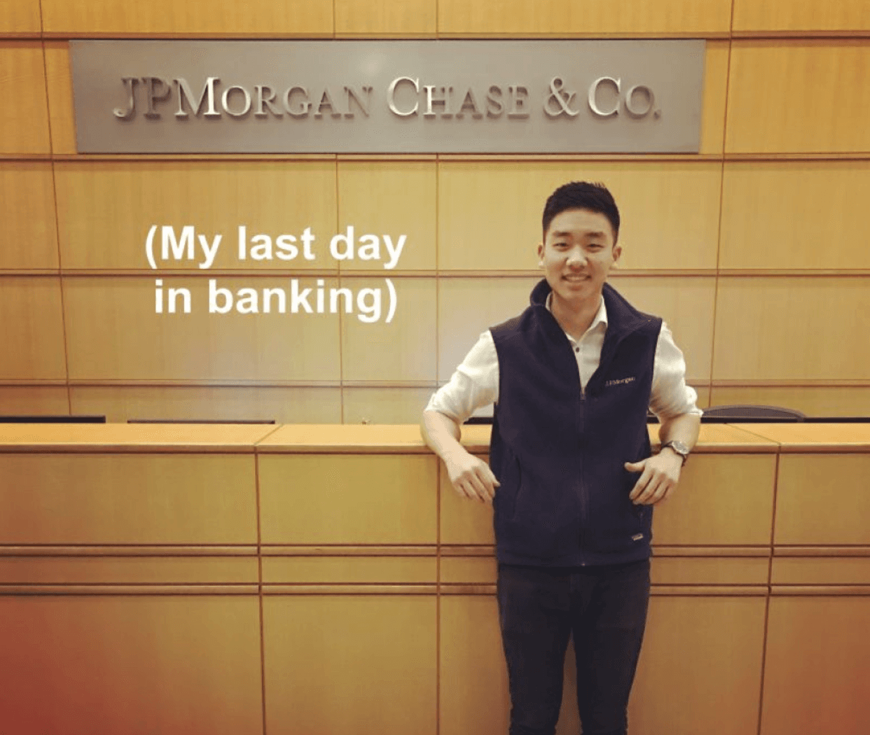 Ben on his last day at JPMorgan after being nominated top analyst. He broke into JP Morgan from Berkeley, became a top analyst, and served as recruiting captain for two years - leading the team that decided which candidates moved to Superdays.
